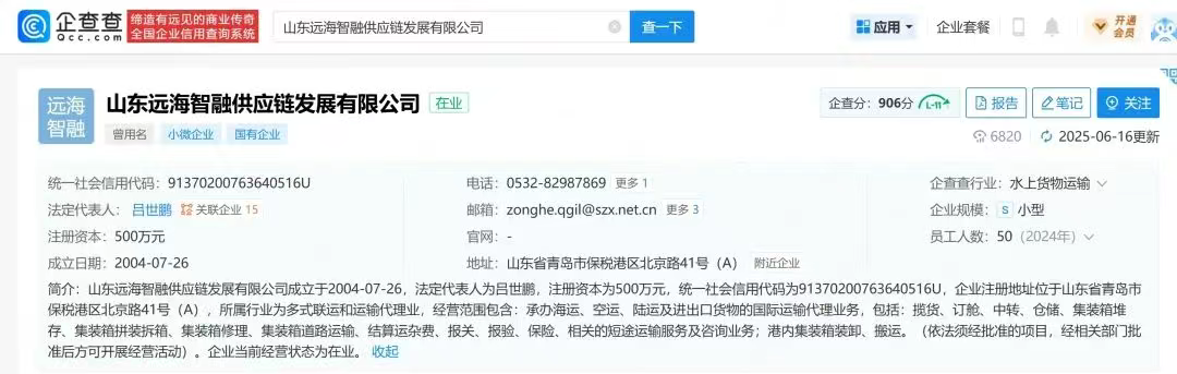 山东远海智融董事长为吕世鹏,其同时还担任山港陆海国际物流(海南)有限公司执行董事、总经理等职务。