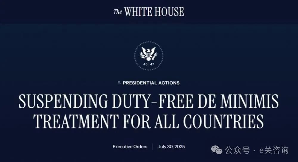 当地时间7月30日,美国白宫发表声明称,美国总统特朗普签署了一项行政命令,暂停对低价值货物的最低限度免税待遇。