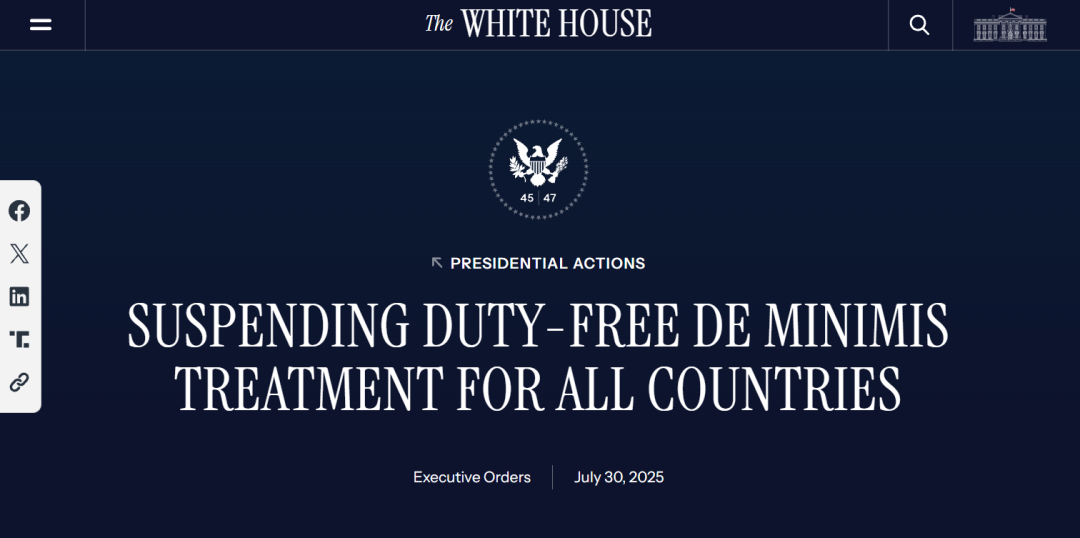 当地时间7月30日,美国总统特朗普签署一项行政命令,暂停对低价值货物的最低限度免税待遇。从8月29日起暂停所有价值800美元(约合人民币5737元)及以下的进口包裹给予免税待遇(即“小额豁免”),届时小额包裹需缴纳适用的所有税费,但符合豁免条件的国际邮政(如FedEx、UPS、DHL等私营物流)包裹免于征税。