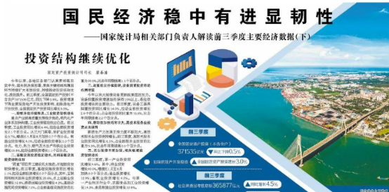 投资发挥关键作用。前三季度,资本形成总额对经济增长贡献率为17.5%,拉动GDP增长0.9个百分点。