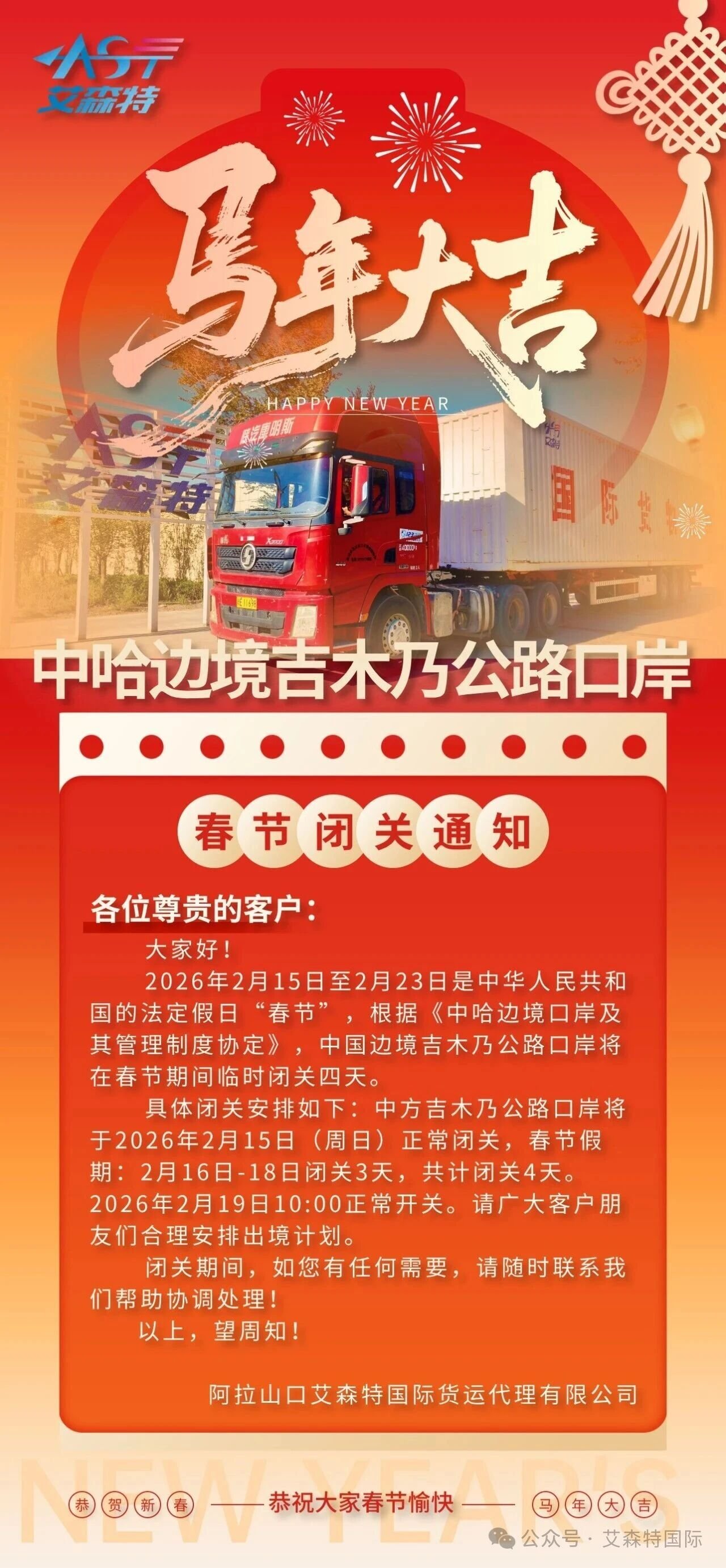 具体闭关安排如下:中方吉木乃公路口岸将于2026年2月15日(周日)正常闭关,春节假期:2月16日-18日闭关3天,共计闭关4天。2026年2月19日10:00正常开关。请广大客户朋友们合理安排出境计划。
