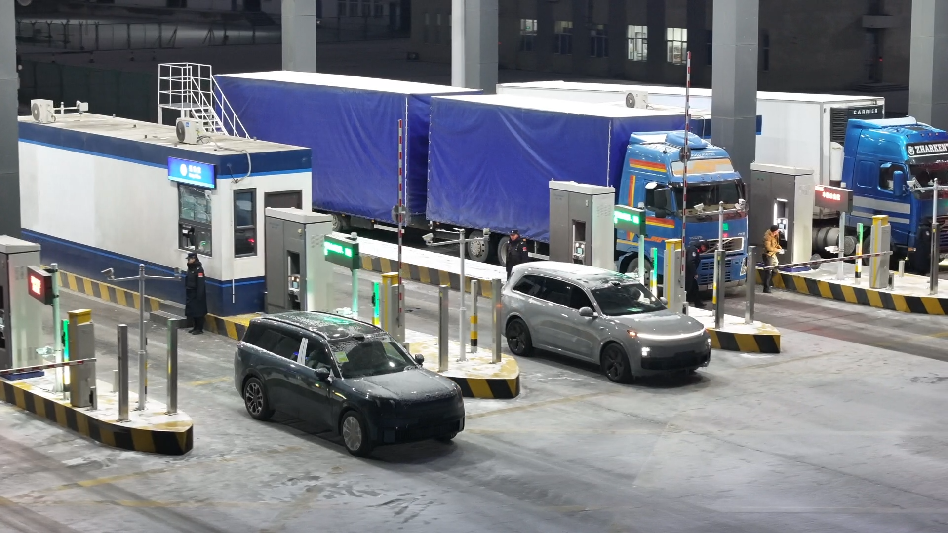 凌晨的霍尔果斯公路口岸货运现场灯火通明,商品车司机驾驶车辆进入了新通道,完成护照读取、生物信息核验后,车道通行杆抬起,整个过程非常顺畅。