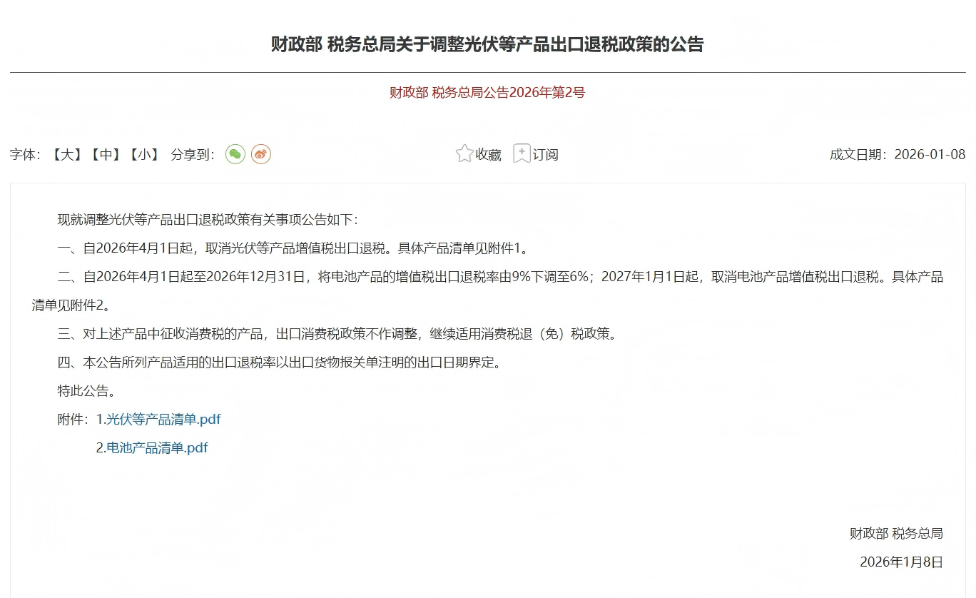 自2027年1月1日起,将全面取消全品类电池的增值税出口退税,标志着电池出口彻底进入无补贴时代,所有相关企业将站在同一起跑线公平竞争。此外,本次调整不影响消费税部分,征收消费税的电池产品仍继续适用退(免)税政策。